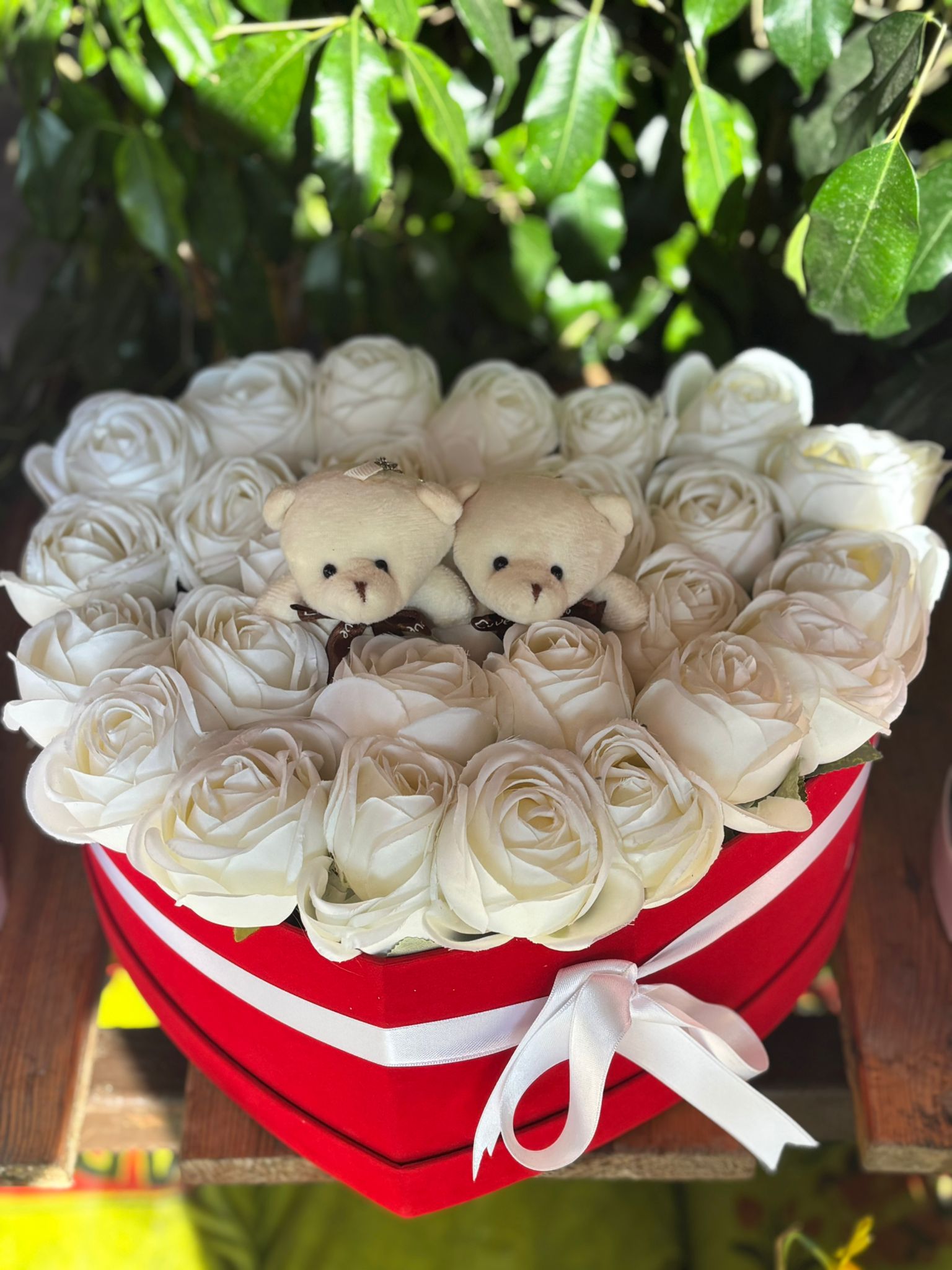 Kırmızı kalpli kutuda yapay beyaz güller